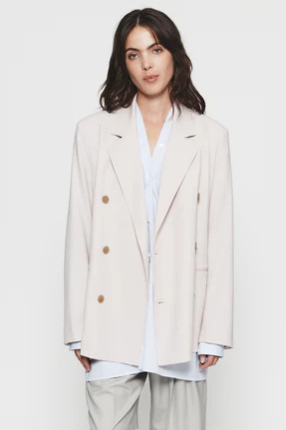 Double breasted blazer with a peak lapel, cut in Italian Wool Twill. This blazer is beautifully structured and menswear inspired. Relaxed with a boxy fit, to slit pockets on the front, single vent at back. Fully lined and finished with horn buttons.