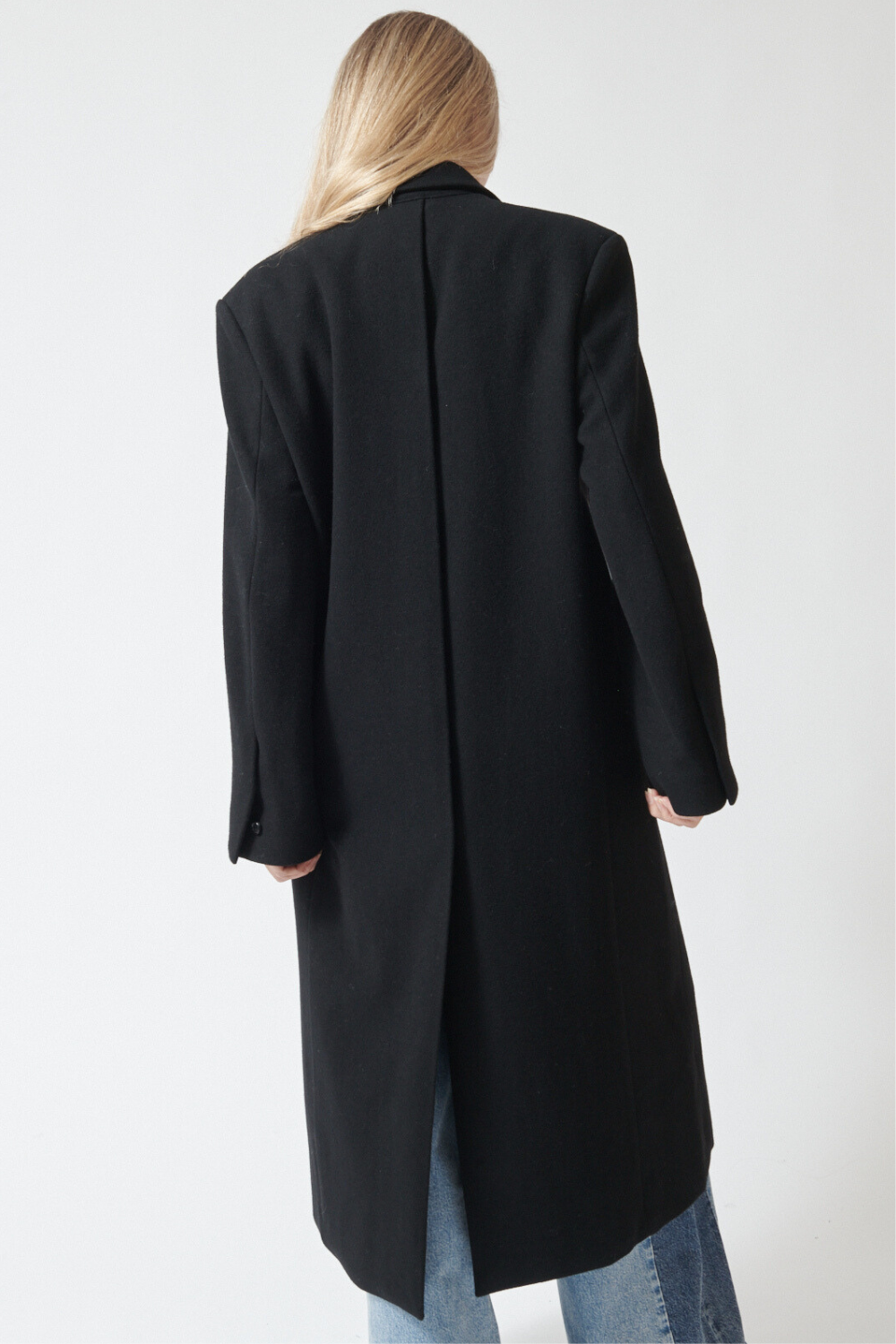 Updated classic Top Coat with new oversized proportions, produced in Wool Cashmere. Oversized peak lapel and double breasted closure. Strong shoulder, long length and beautiful vent at back that can be closed or fully opened via hidden buttons. Single welt pocket at chest and front flap pockets on the low hip. Fully lined in a brilliant blue iridescent lining.