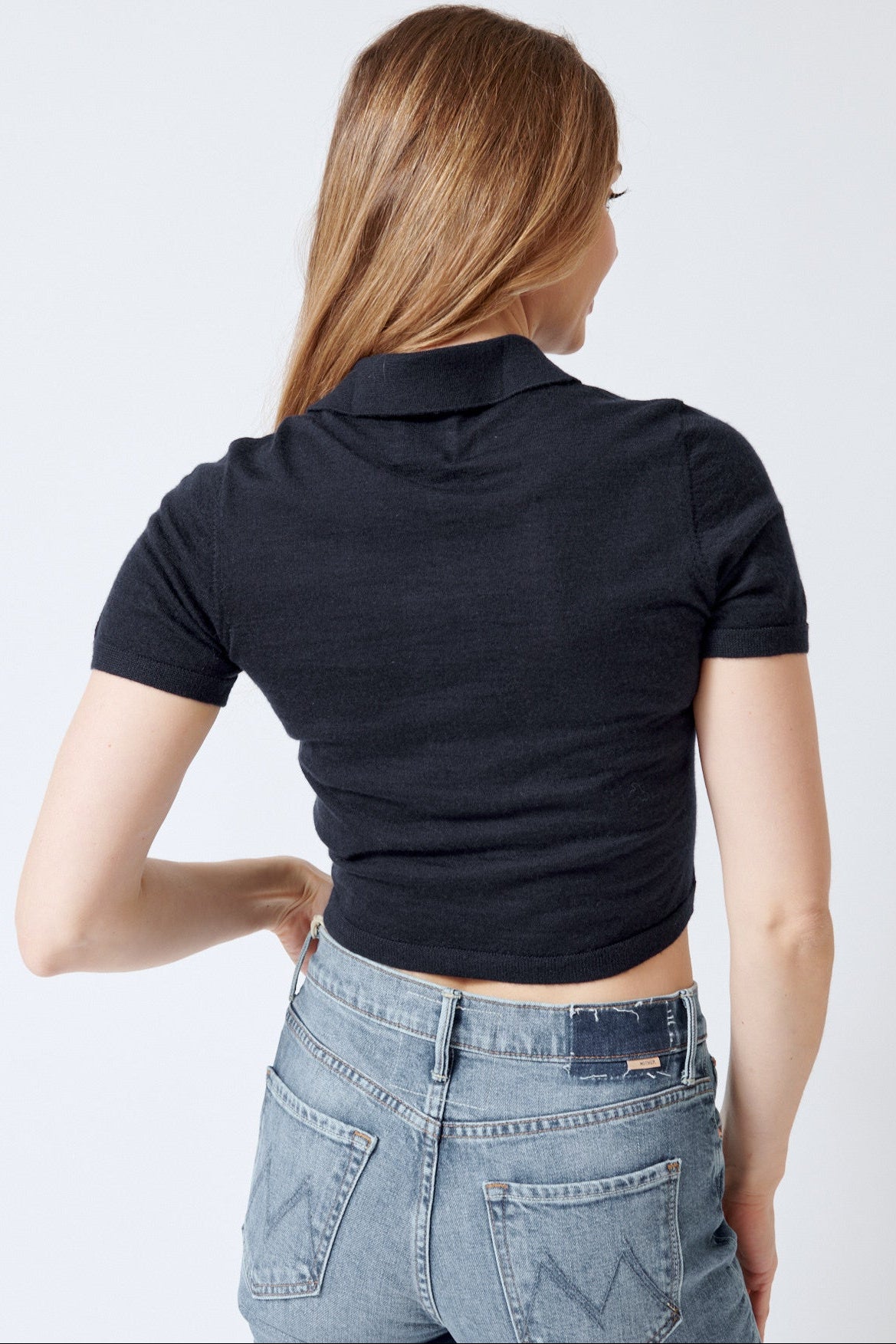 Mari wearing Allude Cashmere Quarter Sleeve Polo Sweater rear view