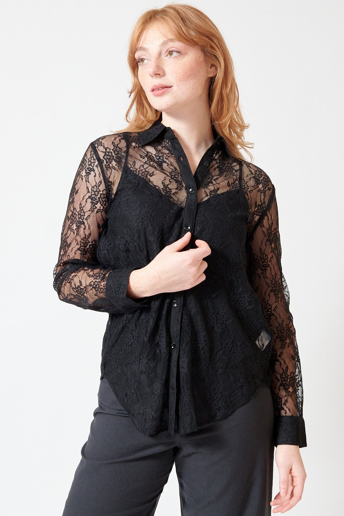 Designed with a relaxed fit through the body and a classic collar and button front, finished with back pleats and a high-low hem. Relaxed silhouette, fitted neckline with shirt collar and button front placket, high-low shirt tail hem.