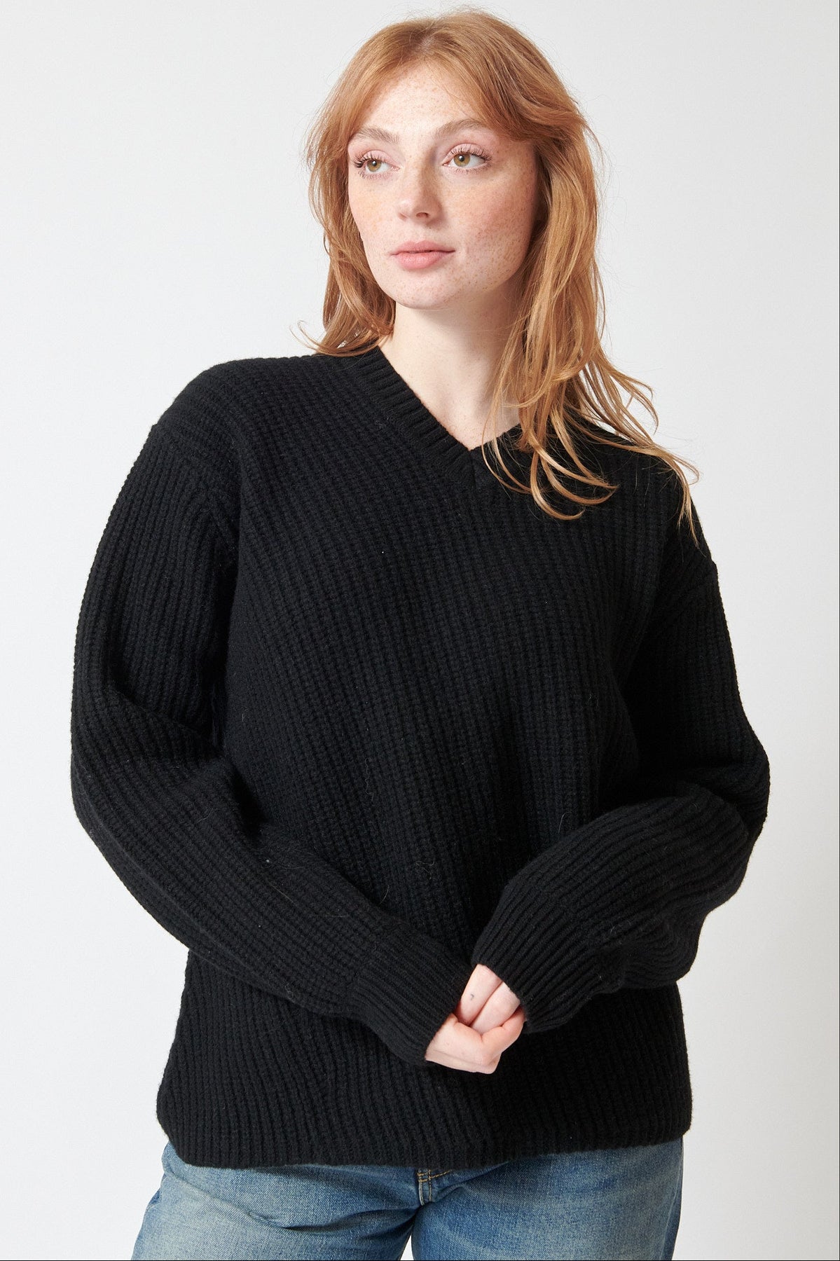 Relaxed fitting sweater with V-neck opening. Produced in an Extrafine Merino Wool, the angled rib knit has a relaxed, easy fit that pulls in slightly at the hip.