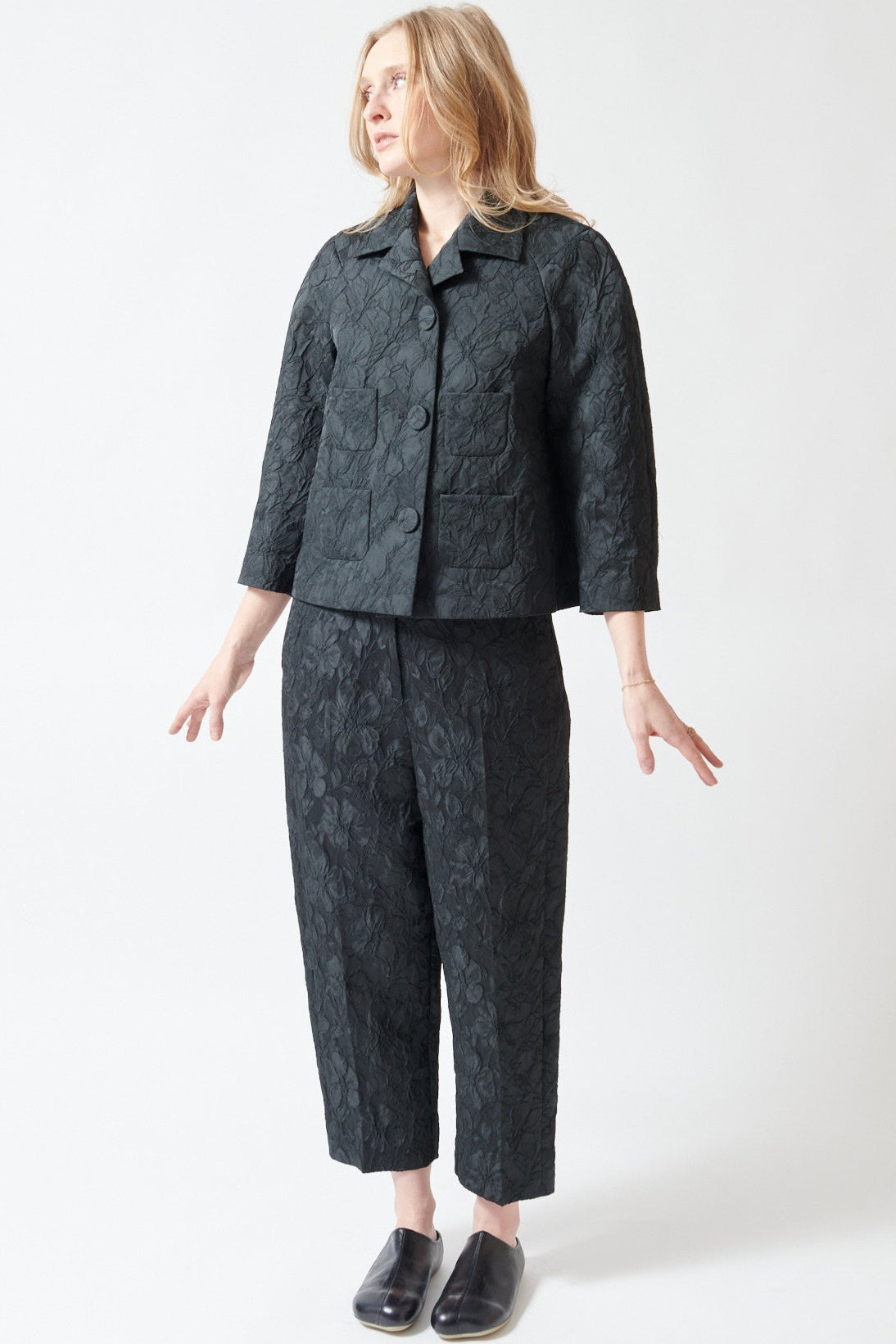 Drop-crotch trousers. Crafted from black jacquard fabric with a textured pattern. Loose, straight fit for a relaxed silhouette. Clean seams along the edges for a uniform finish.