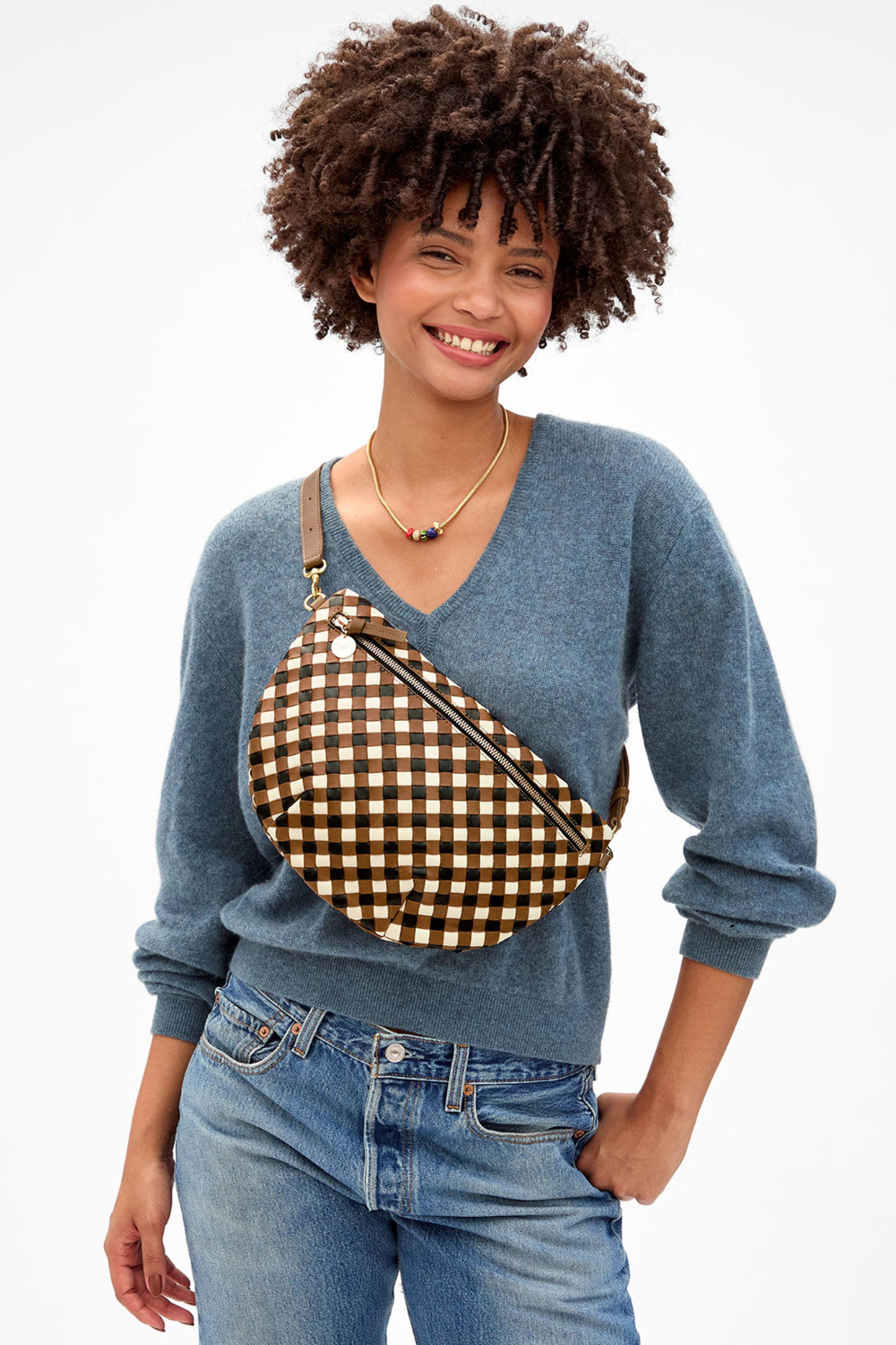 Hand-woven leather upgrades an '80s-inspired belt bag that will have you hands-free no matter how you wear it.