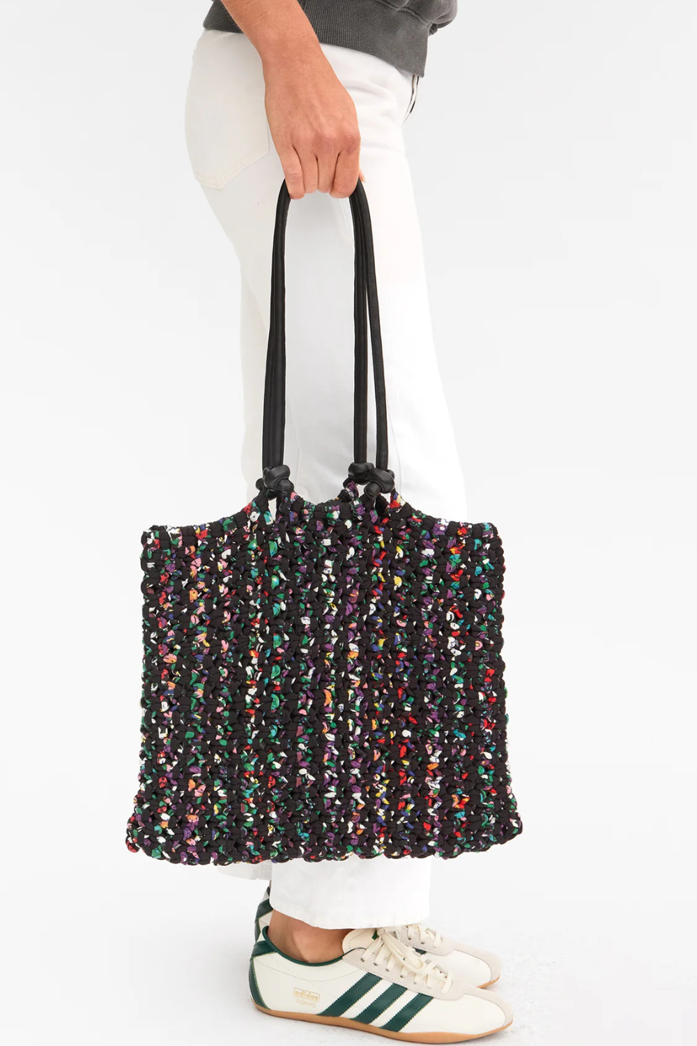 Model holding Clare V. Sandy front view