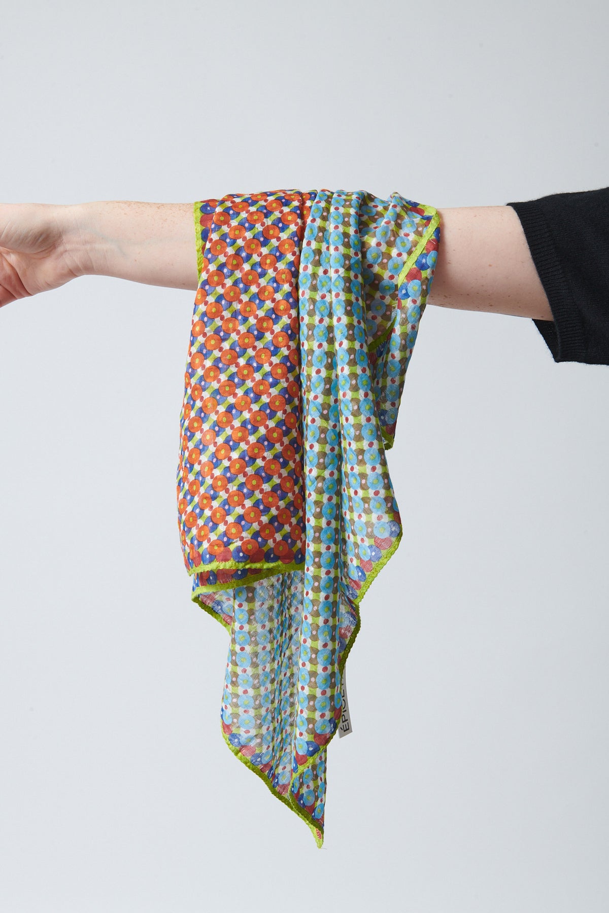 Small square scarf in pure silk with a color blocking style. An elegant, new Graphic pattern combining small checks and dots, elevated by bold, vibrant color combinations. The interplay of hues is fully revealed when tied or styled. Finished with an elegant hand stitched rolled hem. Adapted from our GW 2540 wool square scarves. Digitally printed.