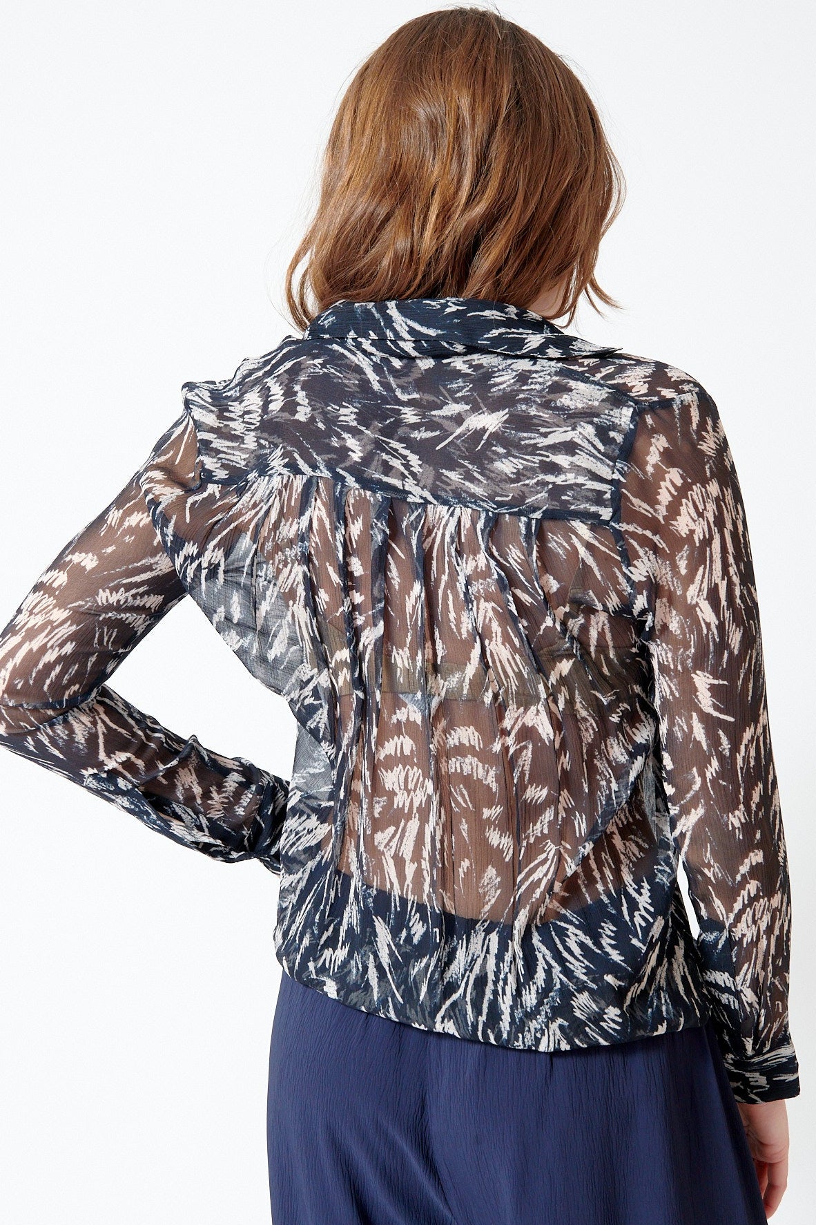 Designed with a relaxed fit through the body and a classic collar and button front, finished with back pleats, a high-low hem, and sheer unlined fabric for an effortlessly airy feel. Relaxed silhouette, fitted neckline with shirt collar and button front placket, high-low shirt tail hem, sheer.