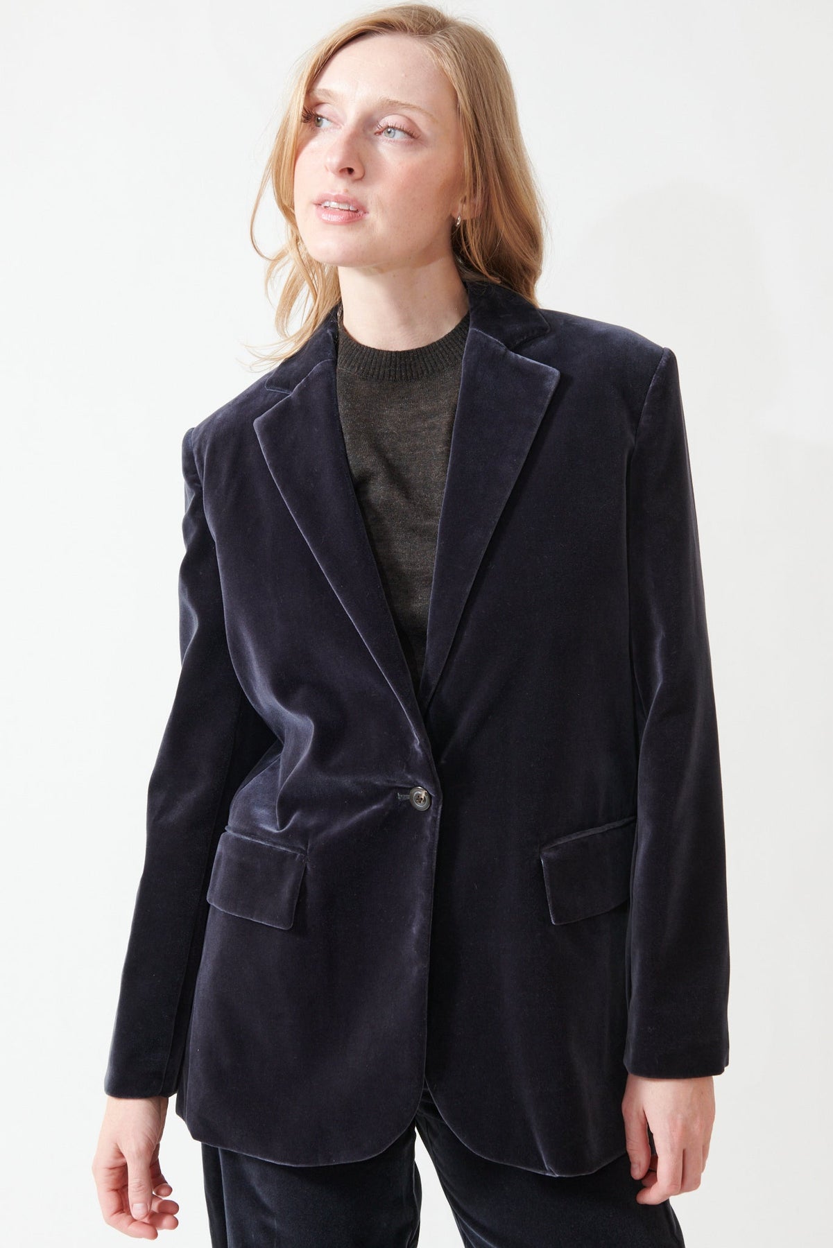 SEVRES is a tailored jacket in smooth grey anthracite velvet, softening masculine lines. Tailored collar and buttoned sleeves add a sophisticated touch.