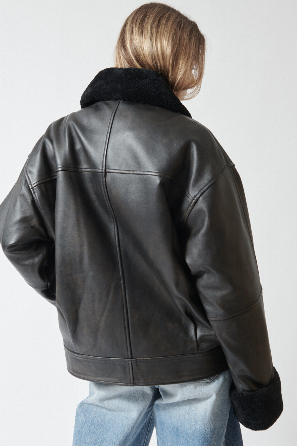 Crafted from 100% lambskin leather, the Val D. Aviator embodies a cool, edgy aesthetic. Featuring a soft collar, diagonal zipper closure and front side pockets, it’s a bold statement jacket.