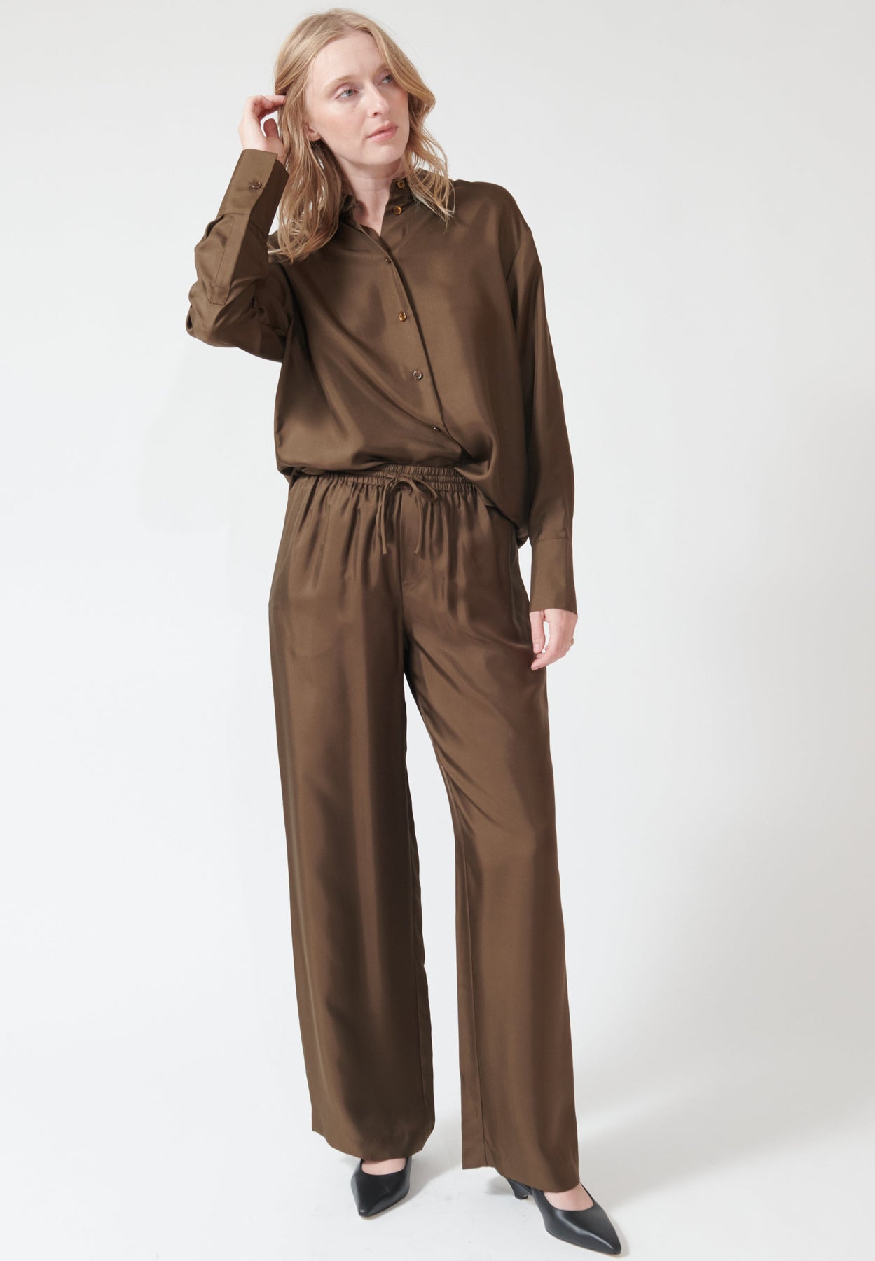 Our staple wide leg trousers with an elastic waistband and drawstring, made in our signature pure silk quality with a twill structure. A timeless classic for every wardrobe.