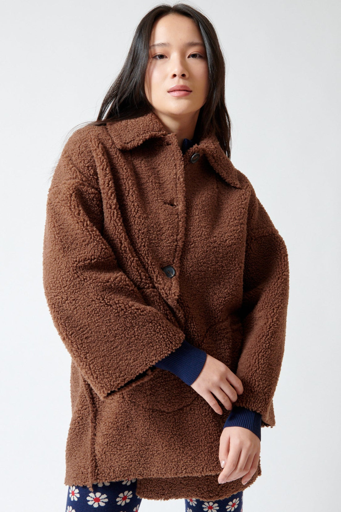 Oversized enough to layer over a chunky knit but still tailored enough to cut a sleek silhouette, The Plush Car Coat. makes a cozy statement. Cut from chocolate colored bonded fleece fabric that’s plush on one side and soft and smooth on the inside, the coat is inspired by a clean cut 1950’s silhouette with dropped shoulders, angled armholes, cropped sleeves, collar, welt pockets, and sophisticated horn buttons up the front. All seams are cut and finished with a pinked micro-zigzag edge.