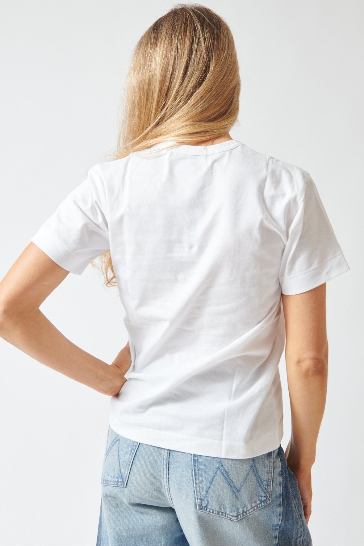 Mari wearing Comme des Garçons PLAY Trio Heart Logo Print T-Shirt rear view