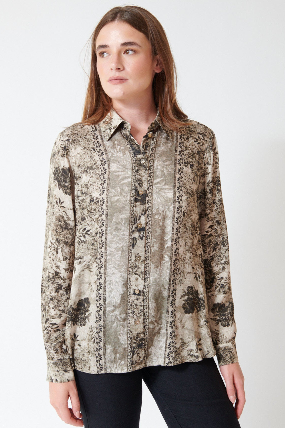 Masculine shirt with bib-effect placed print in fluid jacquard viscose. Shirt collar, rounded hem, visible button fastening and pleated cuffs with mother of pearl buttons.