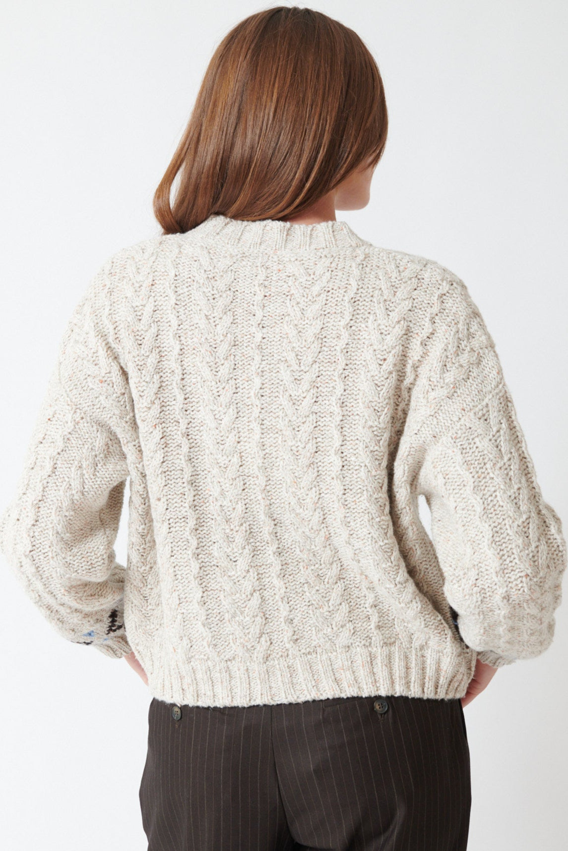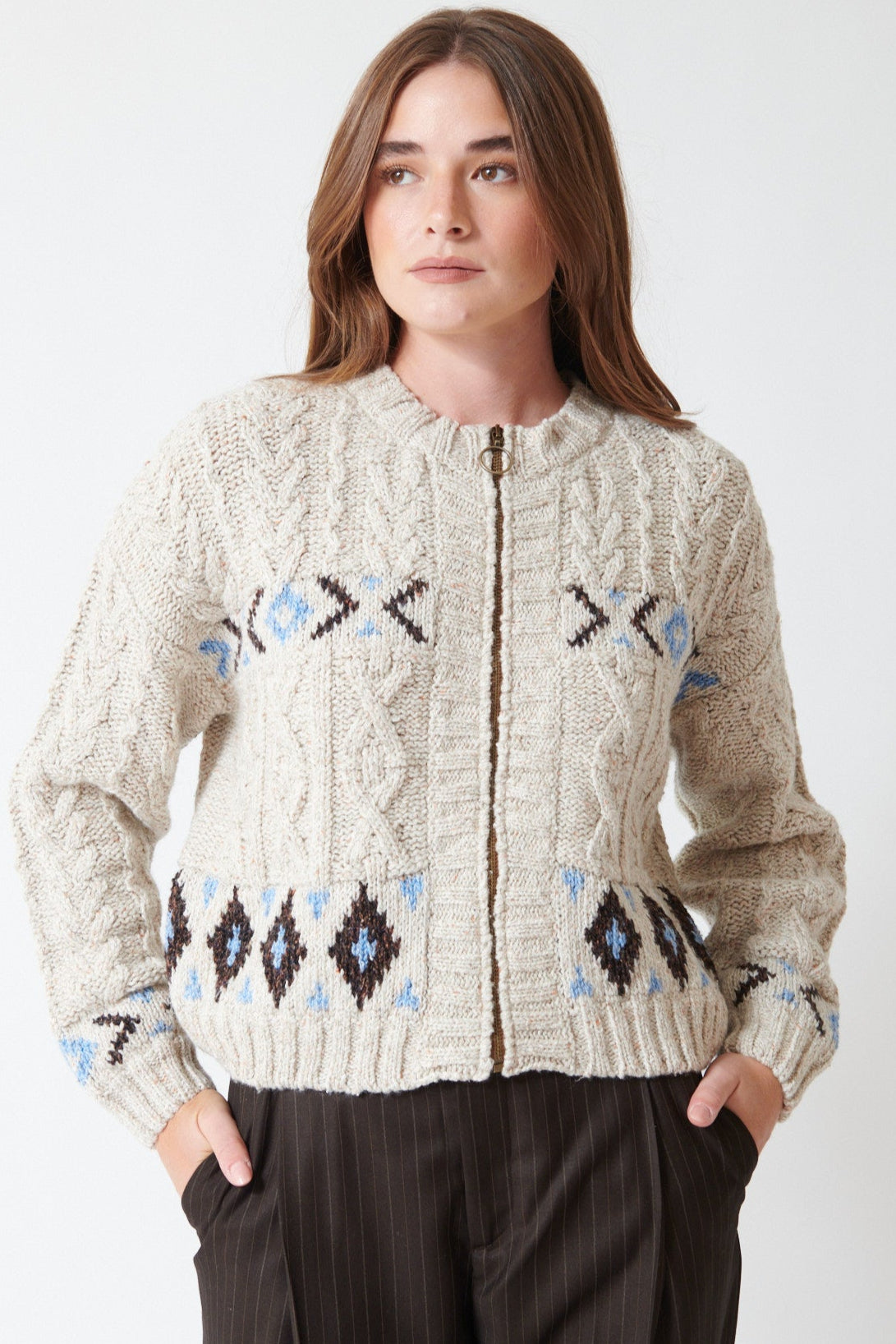 Inspired by vintage Southwestern clothing, The Cavern Cardigan offers a boxy, thoughtfully shrunken fit with a flattering cropped length. The zip-front closure, featuring a metal ring zipper pull, adds an unexpected touch of detail. Knitted in a chunky cable stitch, the cotton, wool, and silk blend yarn is perfect for transitioning from late summer into fall. With neutral shades, Southwestern motifs, and a delicately speckled yarn, this cardigan provides the perfect texture and warmth for cooler nights and coolers days ahead.